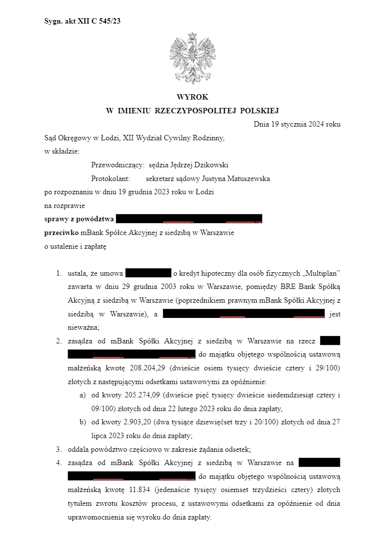 W naszej kancelarii jesteśmy dumni z licznych sukcesów, które osiągnęliśmy dla naszych klientów. Poniżej znajdziesz jeden z ostatnio wydanych wyroków sądowych lub decyzję o zabezpieczeniu.